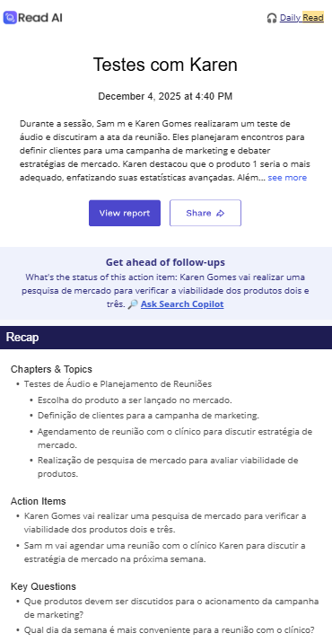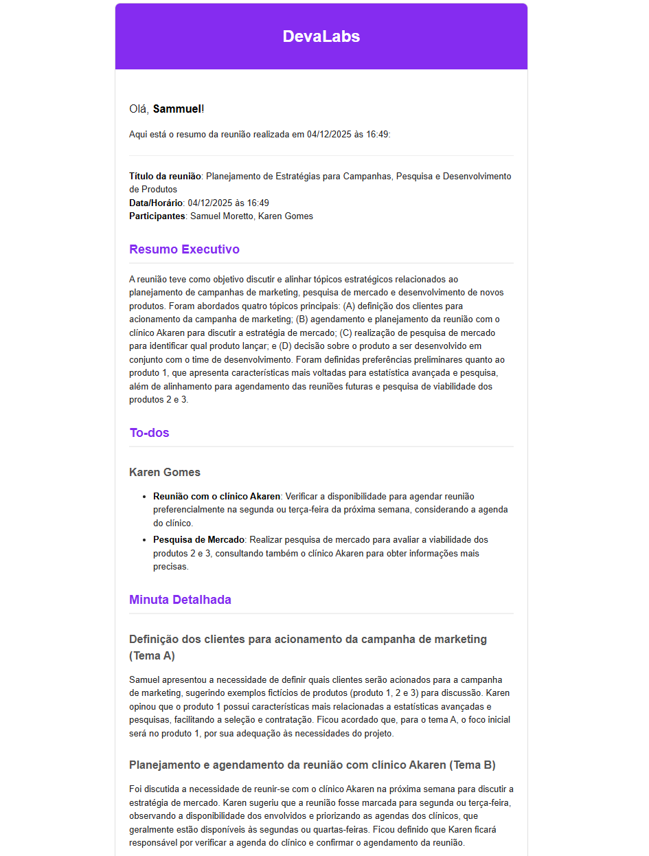 Receba por email em até 3 minutos: cabeçalho completo, to-dos por participante e tema, pontos de atenção, plano de ação e detalhes de cada tema.