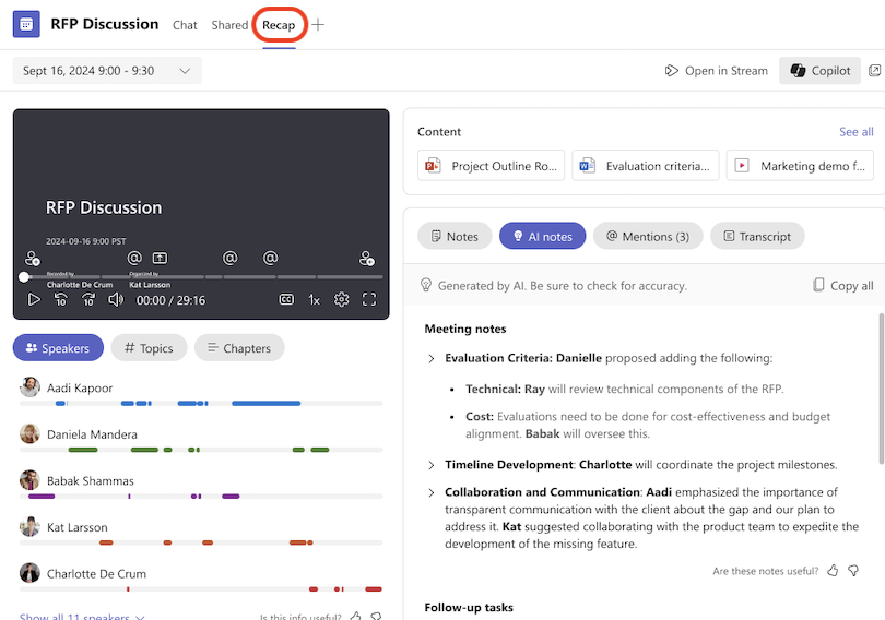 Responde perguntas via chat e áudio durante a reunião usando seus documentos e repositórios.